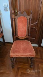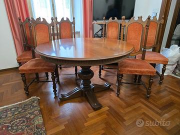 Vendo set da sala in legno di noce composto da un tavolo rotondo con diametro di 125 cm e altezza di 78 cm, insieme a sei sedie coordinate. I mobili presentano uno stile classico con gambe lavorate e sedute in velluto color ruggine rifinite con borchie. Si specifica che tutti gli articoli sono stati attaccati dai tarli e necessitano di un trattamento di ripristino. Per questo motivo il prezzo è particolarmente vantaggioso. È possibile l'acquisto separato: il tavolo viene venduto a 70 euro e il blocco delle sei sedie a 30 euro. Per chi acquista il set completo il prezzo totale è di 100 euro. Misure tavolo: diametro 125 cm | altezza 78 cm. Misure sedie: altezza totale 112 cm | schienale 66 cm | seduta 48 cm di larghezza per 46 cm di profondità. Il ritiro è a completo carico dell'acquirente presso il domicilio situato a Sori, in provincia di Genova. Non si effettua spedizione ed è necessario provvedere autonomamente al trasporto dei mobili.
