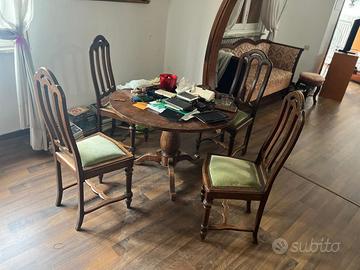 Tavolo in legno massello con 6 sedie milanesi rivestite in velluto verde.