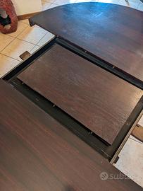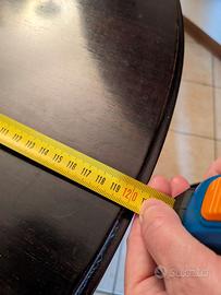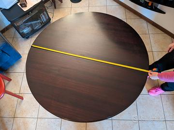 Bellissimo tavolo da pranzo tondo in legno scuro con diametro 120 cm. Base in legno smontabile facilmente a mano con quattro bulloni. Molto stabile e comodo, supporta molto bene gli ospiti e le portate grazie alla stabilità e solidità. Allungabile a 154 cm grazie ad una aggiunta a libretto, sempre in legno, riposta nel tavolo stesso. Qualche graffio e scheggiatura come visibile in foto. Purtroppo non posso spedirlo, visionabile e prelevabile esclusivamente a mano ad Aprilia