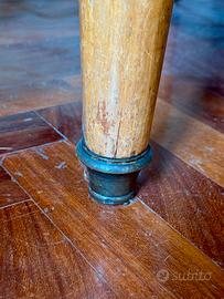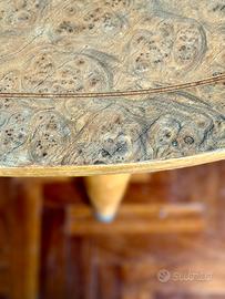 Tavolo tondo in radica circa 130 cm di diametro estendibile con due assi da 45 cm l’una. Utilizzabile e ben tenuto ma scolorito e da restaurare leggermente.