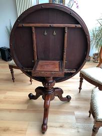 Tavolo tondo inglese 800 in mogano, diametro cm.105, con tre piedi lavorati. Come tutti i tavoli inglesi originali e' ribaltabile a vela con viti e ganci in ottone.