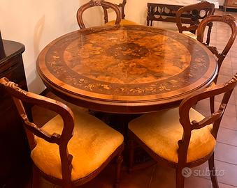 Tavolo tondo allungabile con prolunghe in noce nazionale intarsiato con sedie in velluto igiallo ocra.