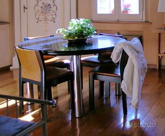Vendo per inutilizzo tavolo tondo Molteni, serie 505, del 1974. E' in frassino blu a poro aperto, diametro cm. 130, con quattro gambe cilindriche in metallo cromato . E' allungabile con una prolunga inserita sotto il piano, e diventa ovale da cm 180x130. E' un tavolo molto solido e stabile, l'ho usato fino all'anno scorso. A parte, se interessati, posso vendere anche le sei sedie che si vedono in foto, in cuoio e frassino blu.