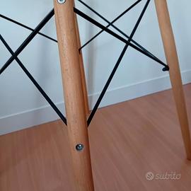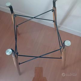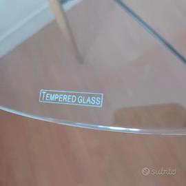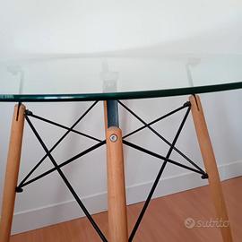 Tavolo tondo tipo scandinavo,gambe in legno massello struttura in ferro nero, ripiano in vetro temperato,con un bellissimo design nordico creato dall'intreccio di legno e metallo.