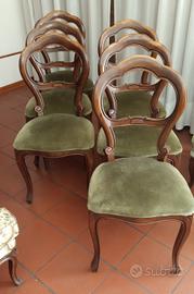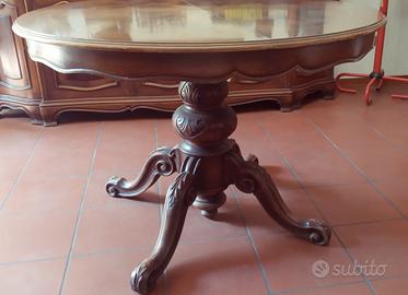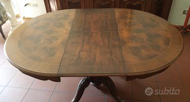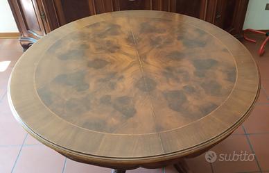 Tavolo tondo in legno come da foto diam. cm 110 allungabile a cm 156 h. cm 78 + 6 sedie con seduta in velluto ben tenute. Segni di uso. Trasporto a carico dell'acquirente. Il tavolo e sedie si trovano a piano terra, no scale salvo 3/4 gradini di accesso.