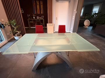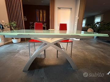 Tokyo di Tonin è un tavolo da cm 160 x 99 allungabile a cm 250 con binario in alluminio e piano in vetro satinato.