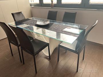 Tavolo Tonin mis. 90x180 fisso in tecnopolimero con piano in vetro+ n.6 sedie in pelle