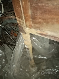 Vecchio tavolo in legno da restaurare ma sano, molto particolare dotato di due lunghi cassetti e uno scomparto sotto il tavolo accessibile tramite uno sportello, come si può notare dalle foto.