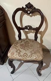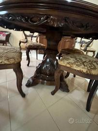 Tavolo rotondo e sei sedue in stile classico ed elegante, piede centrale intagliato, motivo a raggiera, 6 sedie in stile in legno e tessuto.