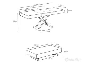 đ Lunghezza: cm 120 (chiuso) cm 153 (1 prolunga inserita) cm 187 (2 prolunghe inserite) cm 220,5 (3 prolunghe inserite) Larghezza: cm 80 (fissa) Spessore : 12 cm , Altezza regolabile da cm 30 (altezza minima) a cm 79 (altezza massima).