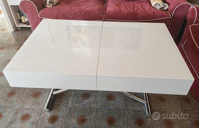 Ozzio Tavolino trasformabile con struttura in metallo e piano in vetro da 120x75 cm bianco lucido con 2 allunghe interne. È scheggiato in un punto (vedi foto) , ma è praticamente impercettibile. Ttasporto a carico dell'acquirente.
