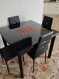 Vendo bellissimo e robusto tavolo nero laccato lucido con quattro sedie abbinate. Il tavolo è allungabile per otto persone e le sedie sono di design in similpelle nera con rifiniture Swarovski sul schienale.