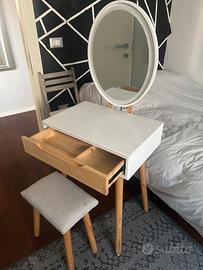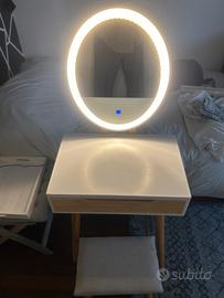 Vendo elegante toeletta moderna in ottime condizioni, perfetta per trucco o come piccolo scrittoio. ✔ Specchio ovale con luce LED integrata ✔ 3 diverse impostazioni di luce (ideale per trucco giorno/sera) ✔ Cassetto spazioso con divisori interni ✔ Include sgabello coordinato ✔ Design moderno con gambe in legno ✔ Colore: bianco e legno naturale Il mobile è stabile, pratico e si adatta facilmente a qualsiasi camera da letto o cabina armadio.