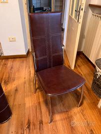 Vendo tavolo da pranzo moderno con piano in vetro temperato e struttura cromata, completo di 6 sedie coordinate in ecopelle marrone.