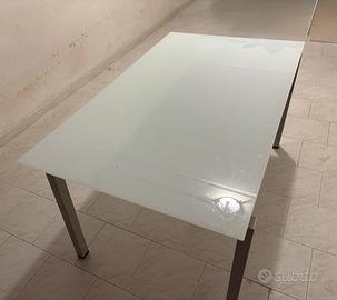 Elegante tavolo con piano in vetro temperato e struttura in metallo allungabile. - Piano in vetro temperato bianco. - Gambe in metallo color argento allungabile Presenta qualche difetto come in foto Consegna da concordare