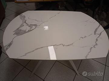 Tavolo nuovo allungabile straordinario con base in metallo colore bianco,piano lucido arrotondato in vera ceramica finitura bianca statuaria con due allunghe all'interno a scomparsa cadauna di cm 30 con apertura e innesto prolunghe automatica.