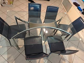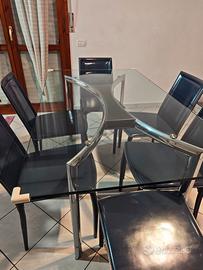 vendesi tavolo in vetro temperato marchio Tonin con piedi in acciaio cromata lucido e inserto in pelle nera, i coprispigoli possono essere rimossi. presenta alcuni graffi, misure 160*90cm. sedie in pelle blu.
