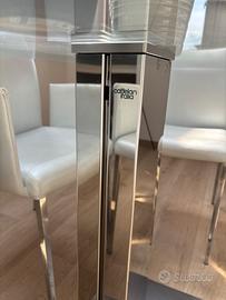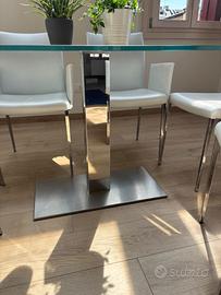 Tavolo in vetro cristallo con base centrale specchiata Cattelan Italia con set di 6 sedie in Pelle bianca perlata tutte Cattelan Italia. Proveniente da Negozio di gioielleria, poi utilizzato per uso occasionale.