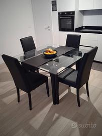 Vendo tavolo in vetro quadrato DESIGN con gambe nere opache, riverniciate un anno fa. Bellissimo sia per la sala che per la cucina. Insieme regalo anche 6 sedie abbinate (come da foto), alcune sono rovinate.