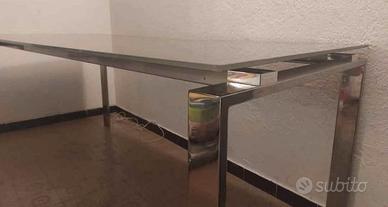Strutturain acciaio satinato spazzolato,completo di un piano semplice ed elegante,realizzato in vetro temperato grigio trasparente(10mm).
