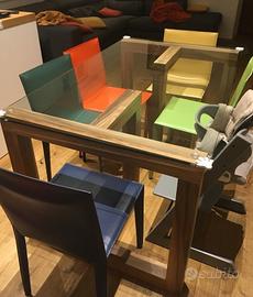 Tavolo con base in vetro poggiato su due T in legno teak. Misure 110x140 cm per 4 persone ma comodo anche per 6.