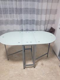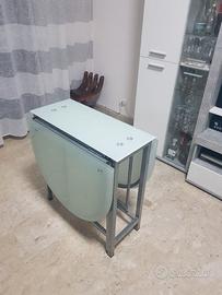 Vendo tavolo vetro temperato salvaspazio, come da foto, dimensioni aperto 140x74 cm , chiuso 32x74 cm. Solo ritiro a mano Roma Magliana
