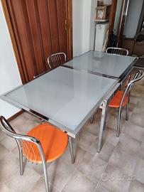 Tavolo in vetro temperato 90×90 allungabile fino a 180×90 con quattro sedie in ferro cromato e seduta arancione. Vendo causa trasferimento URGENTE