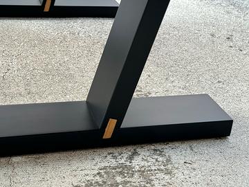 Gambe massicce con struttura smontabile laccate nere ral 9005 con intarsio in rovere atto a riprendere il piano.