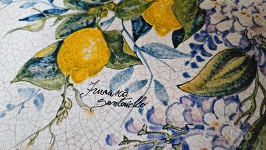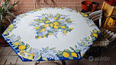 Tavolo ottagonale in pietra lavica decorato a mano a Vietri con firma di Franco Santaniello. Misure 120 centimetri di larghezza per 80 cm di altezza. Solo un piccolo difetto di su un lato visibile dalla foto.. Più quattro sedie in ferro battuto. Zona Roma Valcannuta