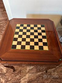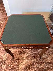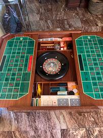 Questo oggetto è un tavolo da gioco multifunzione vintage in legno, probabilmente di manifattura italiana, progettato per ospitare diversi giochi classici. Roulette Centrale: Il centro del tavolo presenta una roulette funzionale, circondata da scomparti per le fiches. Tappeti da Gioco: Ai lati della roulette sono integrati due tappeti verdi simili a quelli del gioco della roulette o del blackjack. Compartimenti: Il tavolo è dotato di numerosi scomparti in legno per organizzare carte da gioco, fiches e altri componenti di gioco. Stile: La struttura in legno pregiato e la disposizione dei giochi suggeriscono un pezzo d'epoca o un oggetto di artigianato artistico.