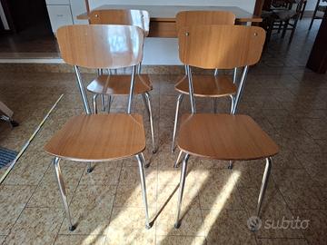 Tavolo vintage anni 60'/70' in perfetto stile retrò. Un set autentico per gli amanti del design d'epoca. Il tavolo è in legno con gambe metalliche e ha un cassetto frontale. Le sedie sono coordinate.