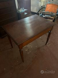 Elegante tavolo vintage in legno massello, dal design sobrio e raffinato. Caratterizzato da una linea essenziale e gambe tornite che donano un tocco classico, è perfetto sia come tavolo da pranzo per piccoli spazi che come scrivania o tavolo da lavoro in ambienti rustici o retrò. La patina del tempo dona fascino e autenticità, ma può essere facilmente restaurato per riportarlo al suo splendore originale. Dimensioni approssimative: 120x70 cm. Condizioni generali buone con segni d’uso visibili.