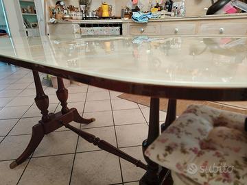 vendo tavolo vintage anni 60/70 struttura in legno intagliato con piedini in ottone e piano in vetro onice. Perfetto senza difetti. Dimensioni larghezza 80cm, lunghezza 180cm, altezza 80cm.