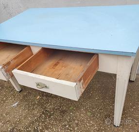 Tavolo vintage modernariato anni 50 da cucina in legno con superficie in formica. Presenti due cassetti. Altezza 80 x lunghezza 146 cm x larghezza 81cm