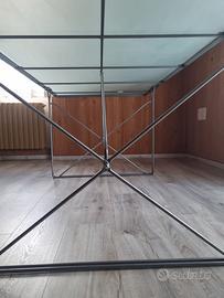 Elegante esempio di design industriale scandinavo, questo tavolo presenta un piano in vetro temperato smerigliato e una struttura in acciaio verniciato a polvere color grigio opaco. Versatile e dal carattere deciso, si adatta perfettamente come tavolo da pranzo o scrivania.