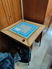 tavolino in legno e ceramica con scacchiera e backgammon, gambe in metallo. vintage anni 60/70