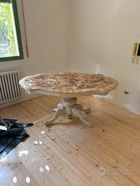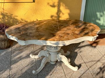 Vendo tavolo ovale stile classico, molto scenografico e di grande presenza. Base centrale con lavorazioni e piedi intagliati, finitura bianca (stile shabby/vintage). Piano in legno decorativo con venature tipo radica/intarsio, con bordo lavorato: dal vivo fa un effetto davvero elegante e “importante”. Misure: 174 lunghezza 111 larghezza H. 80 cm Ritiro a mano in zona o possiamo accordarci per trasportarlo. Prezzo trattabile