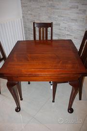 Descrizione: Elegante tavolo da pranzo in stile vittoriano, risalente ai primi del '900. Realizzato in legno massello, presenta una struttura solida e dettagli artigianali tipici dell’epoca. Il tavolo è estendibile, ideale per ospitare da 4 a 8 persone. Accompagnato da 4 sedie abbinate, anch’esse in legno, con seduta comoda e design coerente con lo stile del tavolo.