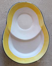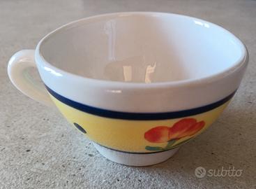 Vendo a 10 euro una tazza con piatto porta biscotti in ceramica decorata, mai utilizzata.. Il diametro della tazza è di circa 11 cm, mentre il piatto ha una lunghezza di 24 cm e una larghezza massima di 18 cm circa.