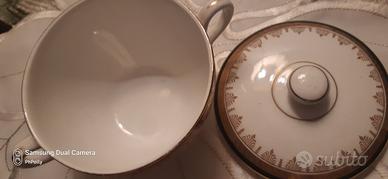 Tazza da brodo vintage (utilizzabile come zuccheriera), con bordo e coperchio decorati con un elaborato disegno in oro zecchino, in porcellana inglese Made in England.