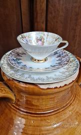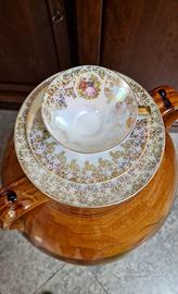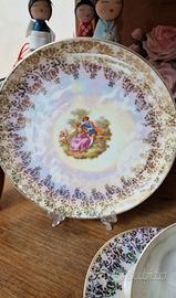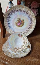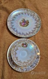 bellissima tazza da tè da collezione vintage Bavaria con doppio piatto .colore avorio iridescente oro e decoro Fragonard.nuova mai utilizzata.diametro tazza 10,5