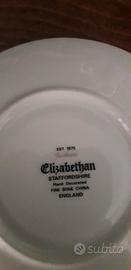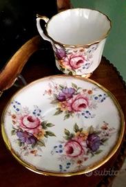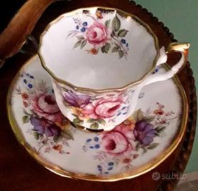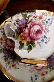 Tazza da tè in porcellana inglese della Elisabethan modello Jacobean. Decorata a mano. Massicce dorature; decoro floreale presente su entrambi i lati della tazza. Rara