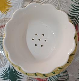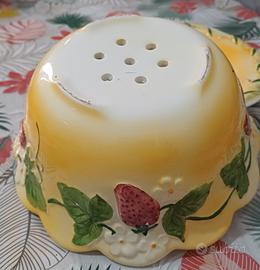 Vendo tazza con fori nel fondo con piatto-scodella in ceramica per fragole in ottimo stato.