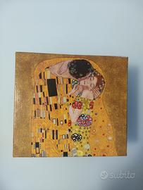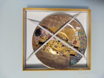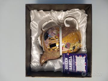 Set in porcellana composto da teiera, tazza e piattino ispirato a "Il Bacio" di Klimt. Scatola regalo in cartone decorato. Articolo nuovo e completo di garanzia. H: 14 cm Capacità: 0,35 l