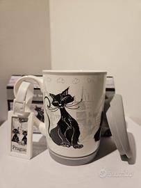 Tazza in porcellana con immagine dei gatti nelle capitali europee, in questo caso Praga. Tazza è completa con la basetta e coperchio in silicone antiscivolo, molto pratico in viaggio e in ufficio. Inoltre nel set è compresa anche una targhetta per la valigia. Tutto chiuso in un cofanetto con il lucchetto e chiavi. Idea regalo originale. Disponibili altre varianti.