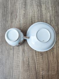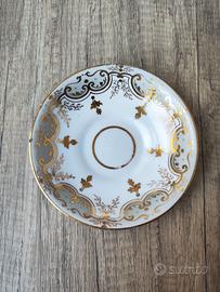 Il piattino sottotazza è di forma contenitiva, tipica dell'epoca.