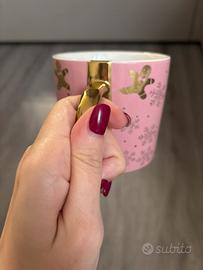 Mug 400ml rosa con disegni natalizi color oro con coperchio con fiocco oro. Nuova mai utilizzata. Aperta la scatola per fare le foto