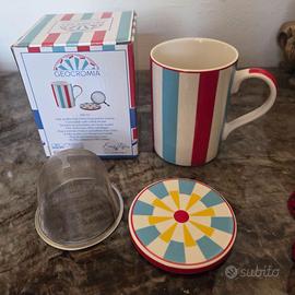 Tazza in fine porcellana con infusore in metallo e coperchio sottobicchiere, ideale per preparare tisane.