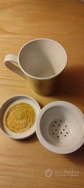 Tazza per tisane con filtro e coperchio in ceramica. Mai usata. Stampa effetto corda. Senza difetti.