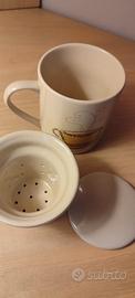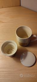 Tazza per tisane con filtro e coperchio in ceramica, beige. Mai usata. In regalo la seconda uguale con filtro, che ha il coperchio lesionato come da foto allegata.